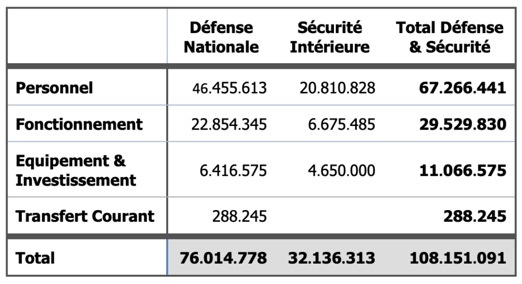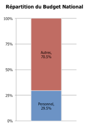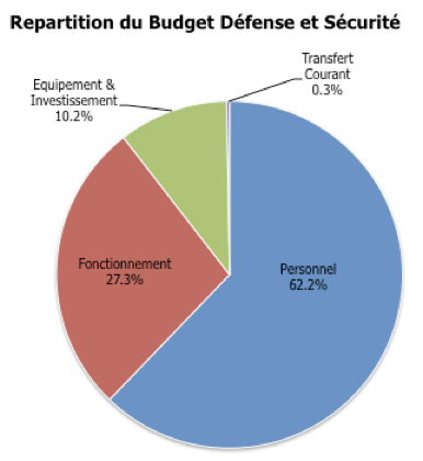 Avec la dotation extraordinaire – qui ramène le budget à 149.17 milliards FCFA – le ratio du personnel devient 45% ; sensiblement inférieur à celui du budget militaire Français, mais toujours plus élevé que la moyenne du budget national.