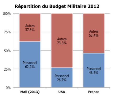 Il devient très vite apparent que les salaires et autres émoluments de la troupe représentent la part belle du budget de la défense ; 62.2% comparé à 29.5% pour toute la fonction publique. Ce chiffre apparaît également démesuré lorsqu’il est comparé à celui d’autres pays. Le graphique ci-dessous montre la part des salaires dans le budget militaire des USA et celui de la France – respectivement à 26.7% et 46.6%.