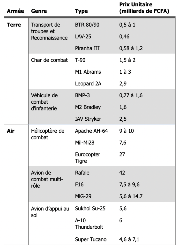 Dans le Tableau 5, nous donnons des coûts approximatifs de certaines armes de guerre. Ces coûts ont été déterminés sur la base de contrats d’armement rendus public – par ex., le prix de l’hélicoptère d’attaque Mil Mi-28 (USD $15 million) a été établit sur la base d’un contrat passé entre la firme russe Rosoboronexport et le gouvernement Kenyan. Nous donnons aussi des fourchettes de prix quand plusieurs contrats existent ; le prix réel dépend en réalité de plusieurs facteurs. Il est clair qu’avec 11 milliards de FCFA, les forces de défense et sécurité prendront plusieurs décennies pour s’approvisionner convenablement.