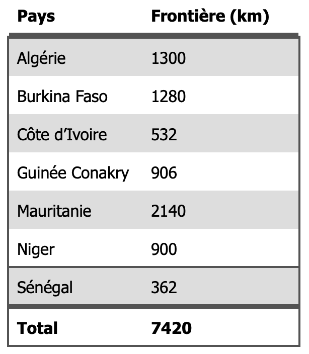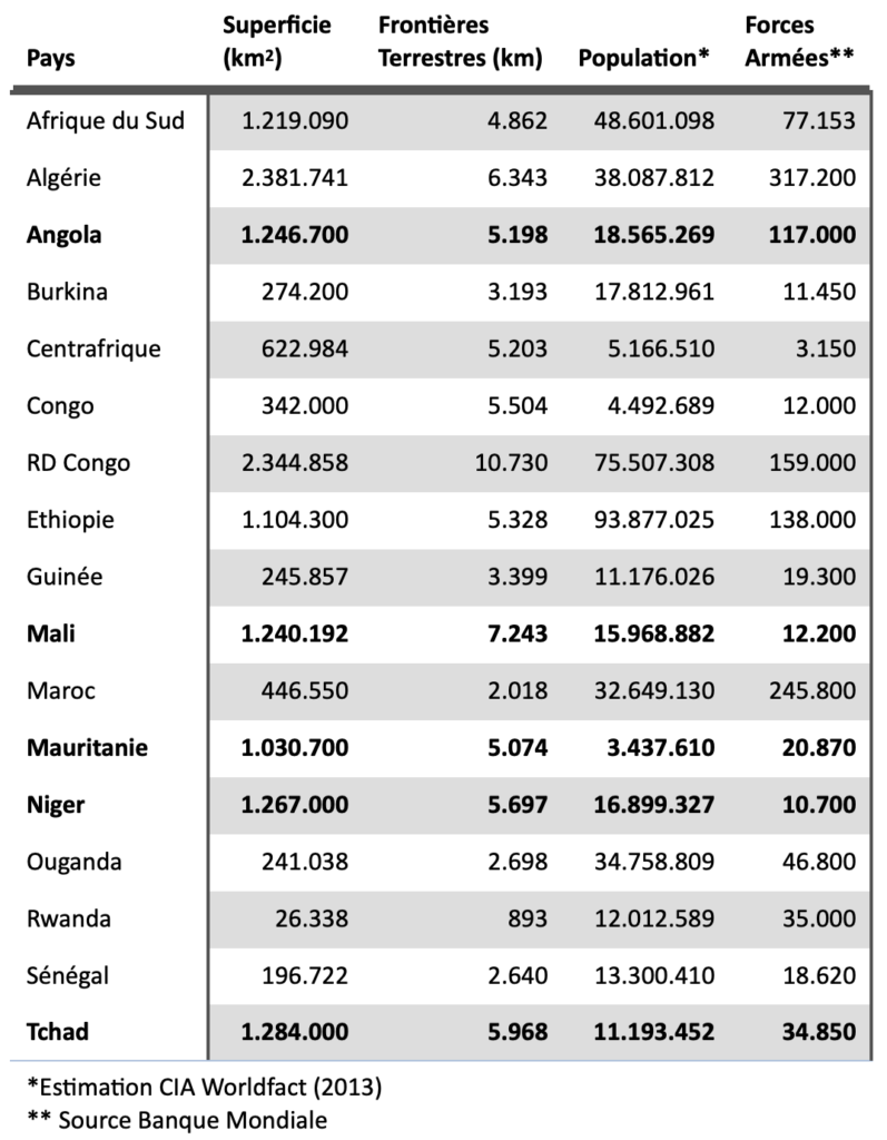 Comme le Mali, le Niger, la Mauritanie, l’Algérie, la Libye et le Tchad ont la particularité d’être très vaste et très peu peuplé – surtout dans leurs zones désertiques qui couvrent 60 à 80% de ces pays. Si théoriquement la souveraineté de ces pays sur ces vastes étendues désertiques est reconnue, dans les faits ces zones échappent partiellement (ou totalement) au contrôle des états. Ils n’ont ni les moyens humains ni matériels à faire prévaloir la suprématie du pouvoir central, permettant à des groupes locaux de s’affirmer politiquement ou militairement. Dans cette liste, l’Algérie est peut-être l’exception à la règle à cause des moyens financiers dont elle dispose ; mais l’histoire récente prouve que la porosité des frontières s’applique à elle aussi. Dans le Sahara, le transvasement des conflits n’est pas seulement une possibilité, mais une réalité.
