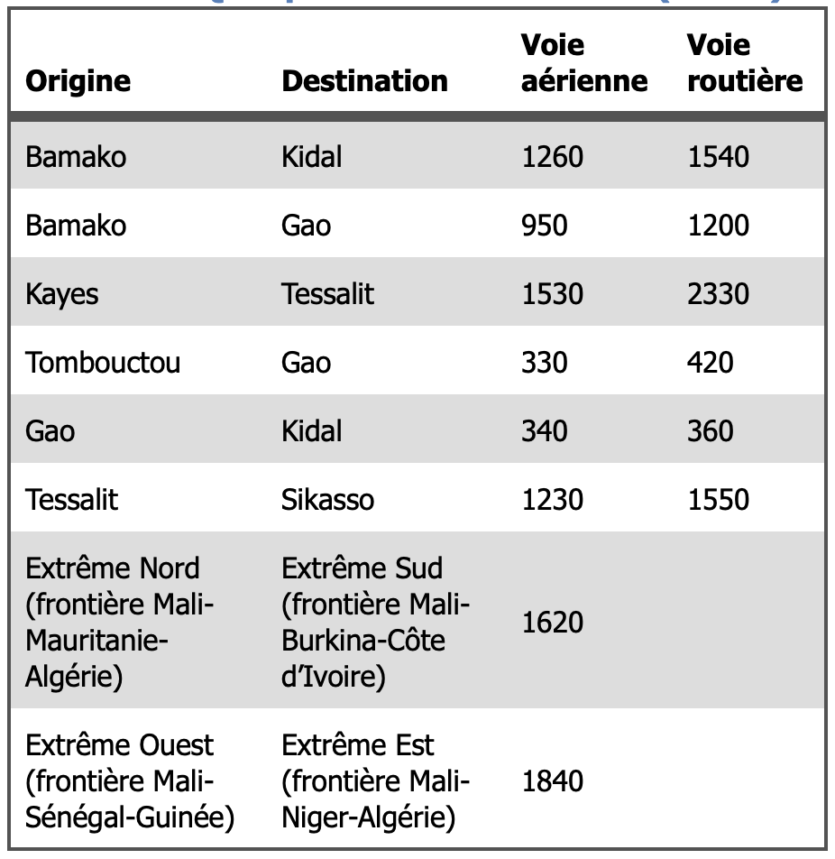 Le territoire du Mali s’étend sur 1.240.000 Km2 avec une très faible densité de population – surtout dans sa zone saharienne qui s’étale entre les latitudes 15 et 25 degré Nord. Pour relier l’extrême sud (frontière Mali-Burkina Faso-Côte d’Ivoire) à l’extrême nord (frontière Mali-Mauritanie-Algérie), il faut parcourir 1840 km par avion ; entre Kayes et Tessalit, il faut 2330 km par route. Le Tableau 2 montre les distances entre certaines localités du pays.