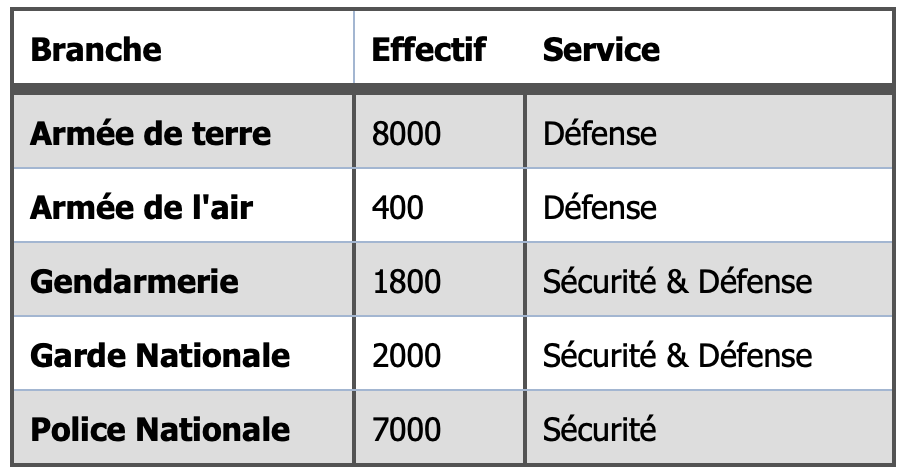 Le tableau ci-dessus donne un aperçu des effectifs des différentes composantes des forces de défense et de sécurité ; elle sont divisées en 5 branches ; armée de terre, armée de l’air, garde nationale, gendarmerie nationale et la police nationale.