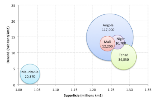 Il ressort que sur cette liste de 17 pays, le Mali se trouve au bas du tableau si on compare les ratios des effectifs des forces armées par rapport à la superficie du pays (15eme place devant le Niger et la RCA) ou par rapport à la population du pays (14eme devant Le Burkina, le Niger et la RCA). Voir le Tableau 7 pour une représentation plus détaillée. Dans le graphique à bulles qui suit, nous comparons le Mali à trois pays (Angola, Niger et Tchad) du fait de leur étendue géographique ou population ; nous ajoutons la Mauritanie à cette liste du fait qu’elle partage les même espace géographique et contraintes sécuritaires que le Mali. Nous y représentons la superficie des pays et leur densité de population sur les axes, et les effectifs des forces armées est représentée par la taille des bulles.