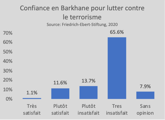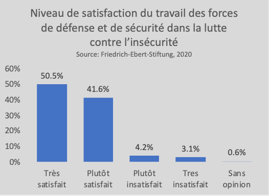 Malgré les innombrables failles, une incapacité à défendre l’intégrité du territoire et assurer la défense des populations, les FAMa représentent de loin l’institution la plus respectée par le public malien. Les militaires sur le terrain engagent leur vie tous les jours. Une enquête d’opinion publiée en 2020 par Friedrich-Ebert-Stiftung révèle que 92% des Maliens se disent « très satisfaits » or « plutôt satisfaits » de ses actions. Ces chiffres sont quasi-constants d’une région à une autre, à l’exception de Kidal, où le niveau de satisfaction n’est que de 5%.