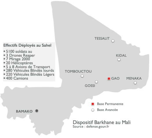 Le but principal de Barkhane est de lutter contre les groupes terroristes en réduisant leur marge de manœuvre, démanteler leurs caches d’armes, couper leur flux logistique, et empêcher la reconstitution de sanctuaires. La force Barkhane est déployée sur 5 bases avancées et sa base permanente de Gao. Sa mission coûte entre 520 et 650 milliards de FCFA par an, sans compter l’appui donné par d’autres forces étrangères comme les États-Unis ou le Royaume Uni.