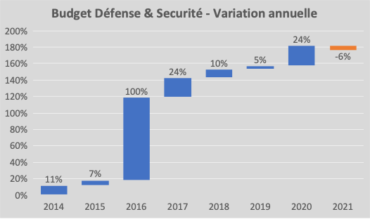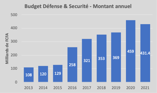 En 2021, les budgets des ministères de la défense et de la sécurité s’élèvent respectivement à 310,9 et 107,2 milliards de FCFA, un total de 431,4 milliards représentant 15,4% du budget national. Le budget défense et sécurité a connu un accroissement rapide depuis 2013 et surtout après l’adoption de la loi de programmation militaire en 2015.