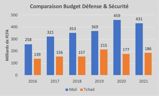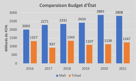 Le constat est similaire quand on compare les moyens respectifs des 2 pays – en termes de budget national. En 2021, le budget malien s’élève à 2808 milliards de FCFA contre 1247 milliards pour le Tchad. L’État malien a simplement plus de moyen que le Tchad.